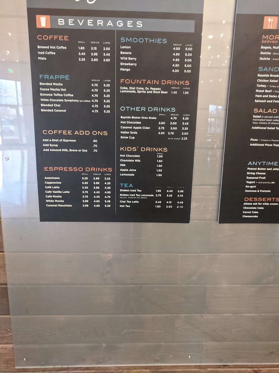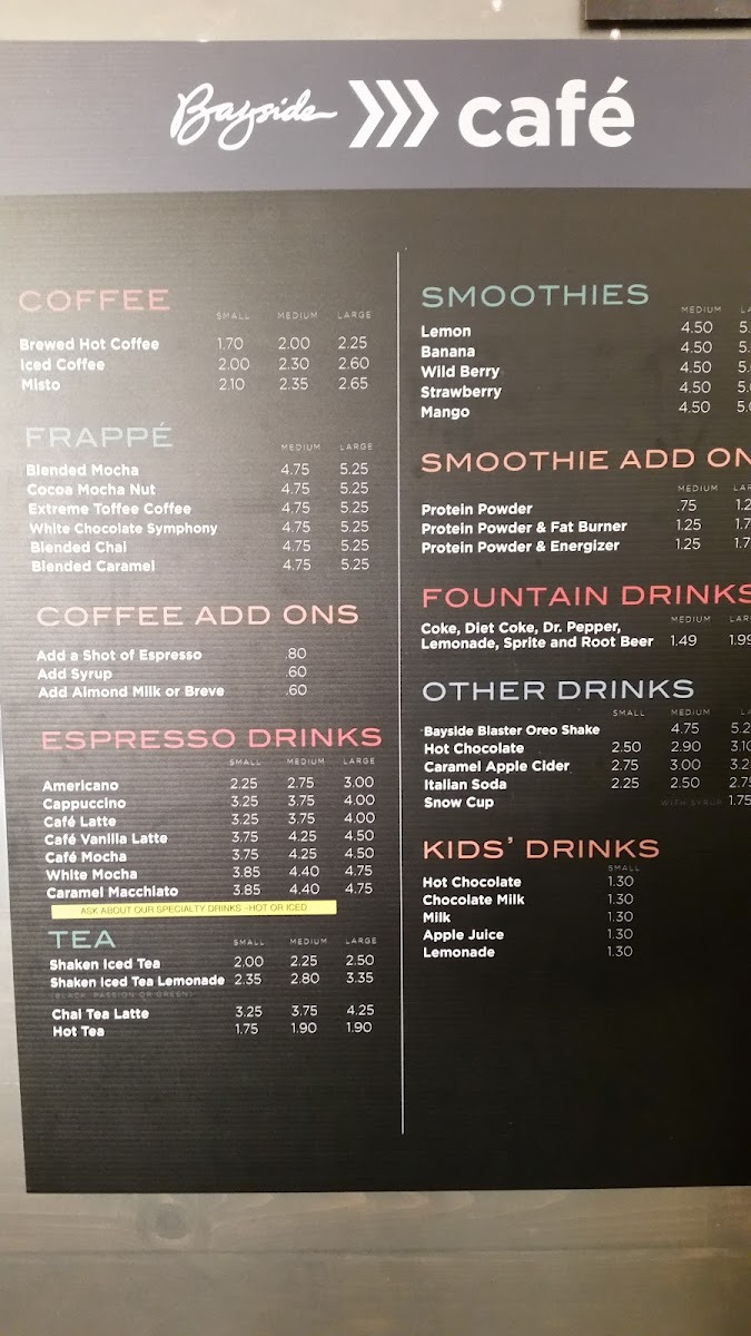 The menu at Bayside Café - Blue Oaks Campus primarily features a selection of coffee, snacks, and light food options suitable for quick orders and casual dining. The offerings are designed to accommodate visitors seeking refreshments during coffee breaks or light meals throughout the day.